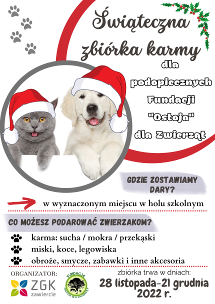 28 listopada 2022 roku rusza świąteczna zbiórka karmy na rzecz czworonożnych podopiecznych fundacji. Akcja przeprowadzona będzie w zawierciańskich szkołach. W wyznaczonych punktach…