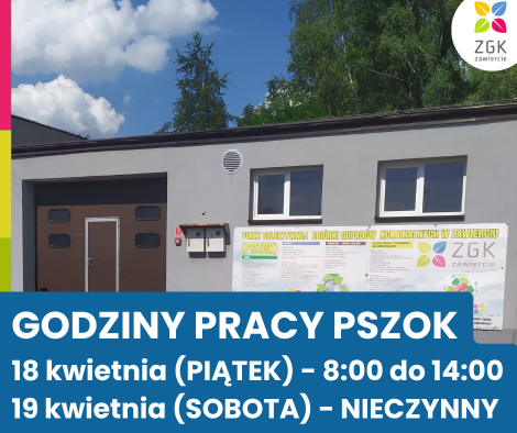 Godziny pracy PSZOK: 18 kwietnia (piątek) - czynny w godzinach od 8:00-14:00 19 kwietnia (sobota) - NIECZYNNY