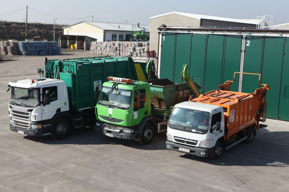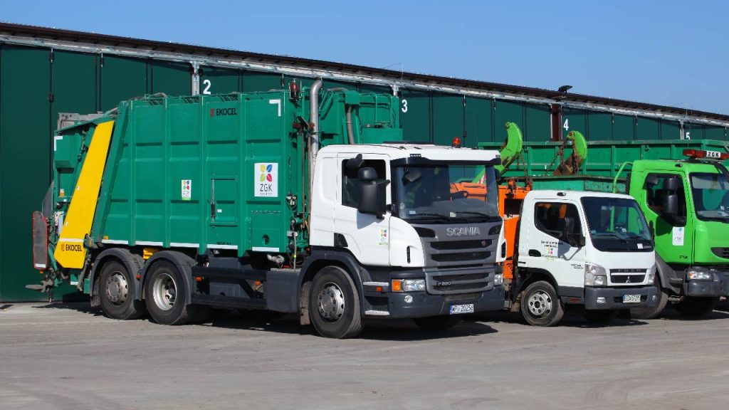 3 samochody ciężarowe- biało-zielona śmieciarka, zielony kontenerowiec oraz biało- pomarańczowy kontenerowiec