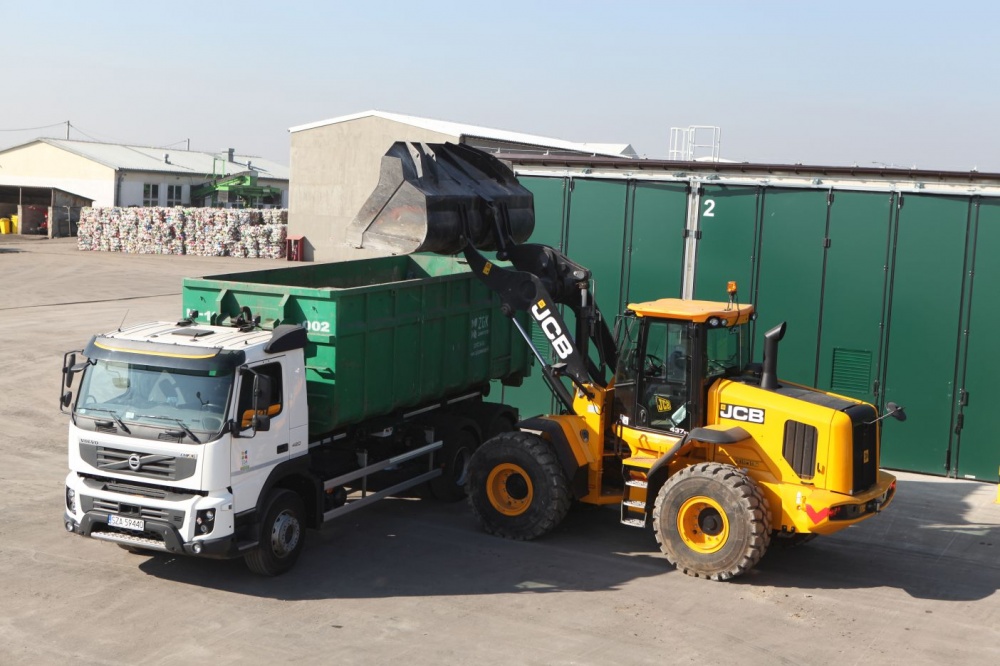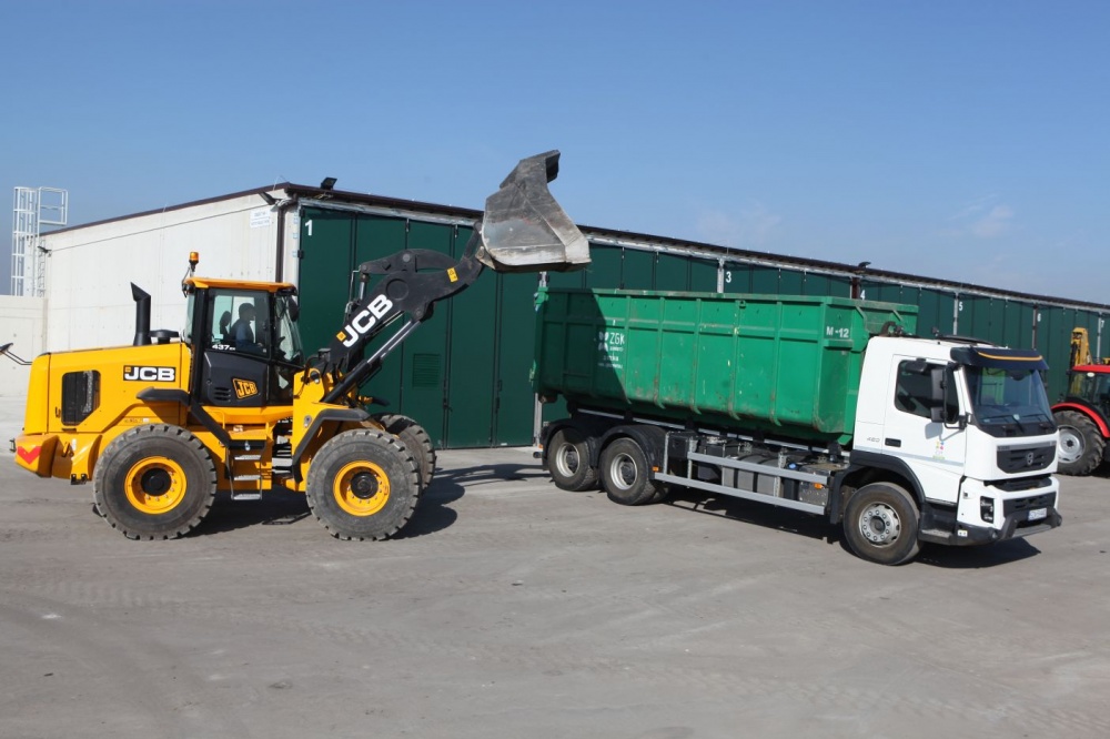 Z lewej strony żółta ładowarka, z prawej strony biały samochód (hakowiec) wraz z zielonym kontenerem