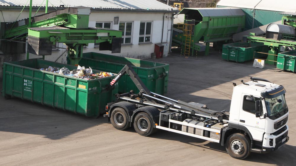 Biały samochód (kontenerowiec) wraz z zielonym kontenerem. W tle biały budynek