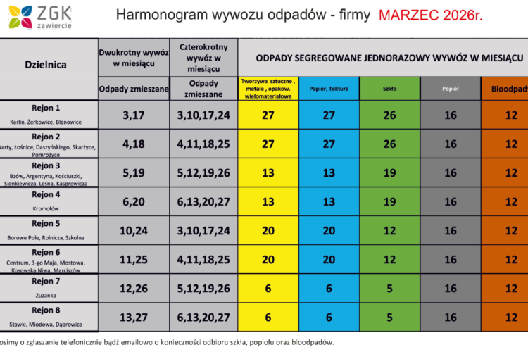 • Harmonogram wywozu odpadów dla firm – MARZEC 2 marca, 2026