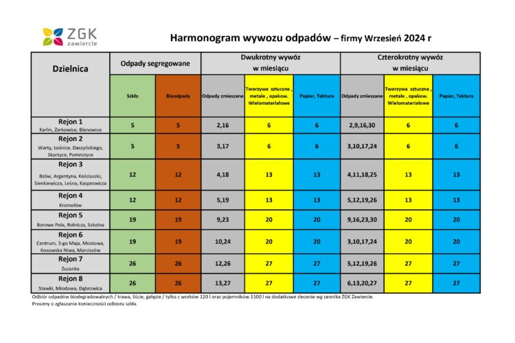 • Harmonogram wywozu odpadów dla Gminy Zawiercie w pierwszym kwartale 2026 roku
