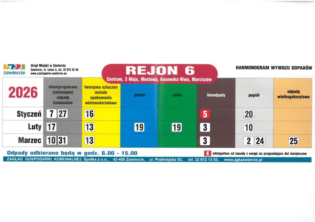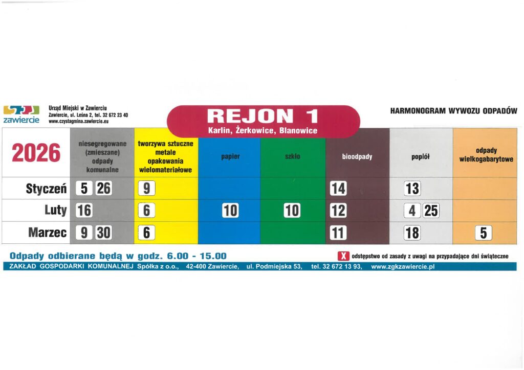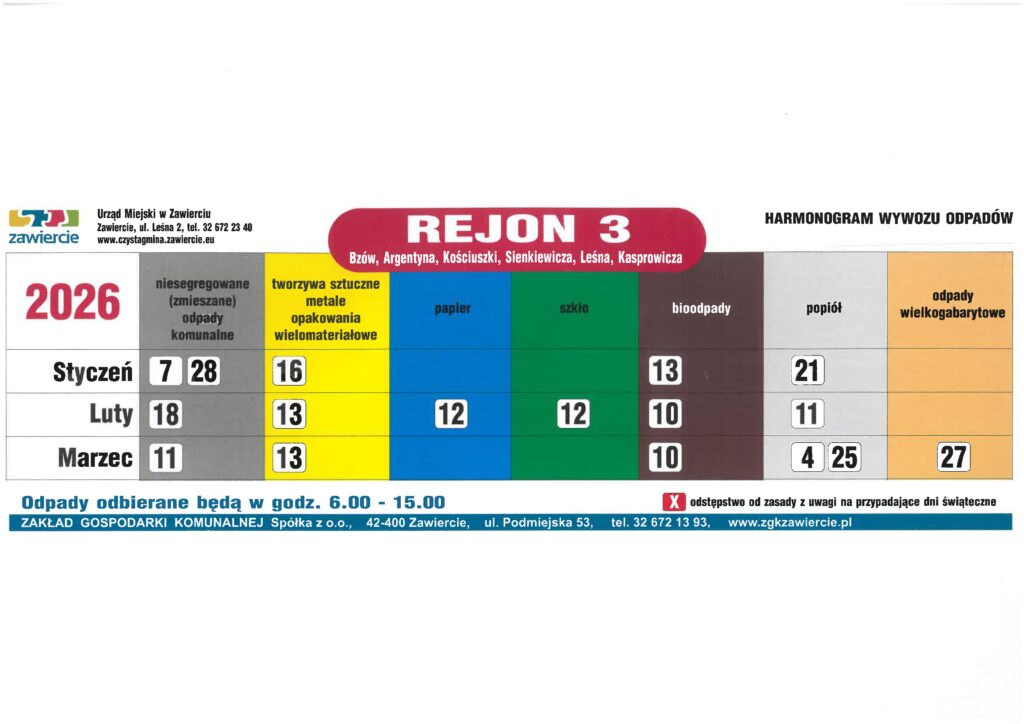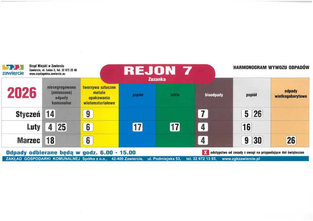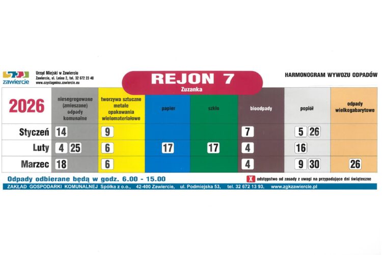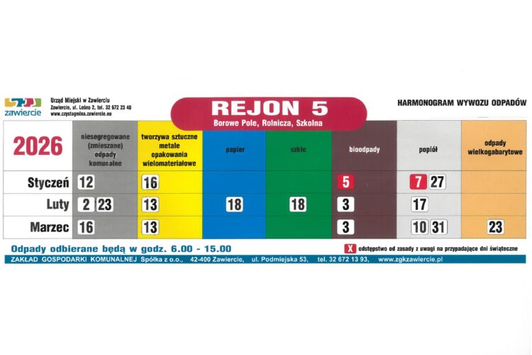• Harmonogram wywozu odpadów dla Gminy Zawiercie w pierwszym kwartale 2026 roku