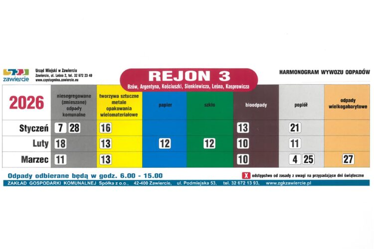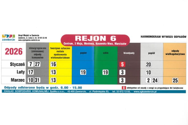 • Harmonogram wywozu odpadów dla Gminy Zawiercie w pierwszym kwartale 2026 roku 31 grudnia, 2025