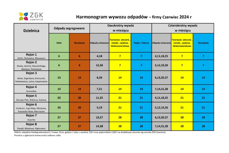 Harmonogram wywozu odpadów - firmy CZERWIEC 2024