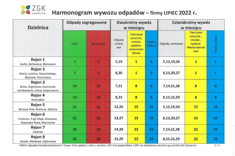 • Harmonogram wywozu odpadów dla Gminy Zawiercie w pierwszym kwartale 2026 roku 31 grudnia, 2025