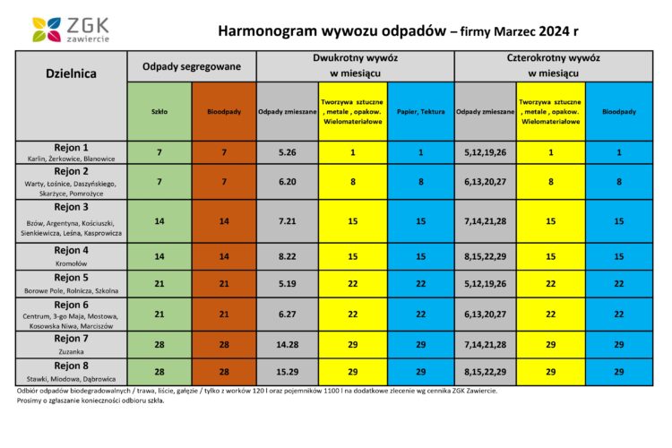 • Harmonogram wywozu odpadów dla Gminy Zawiercie w pierwszym kwartale 2026 roku