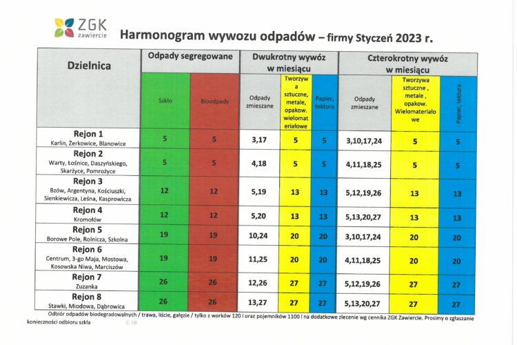 • Harmonogram wywozu odpadów dla Gminy Zawiercie w pierwszym kwartale 2026 roku 31 grudnia, 2025