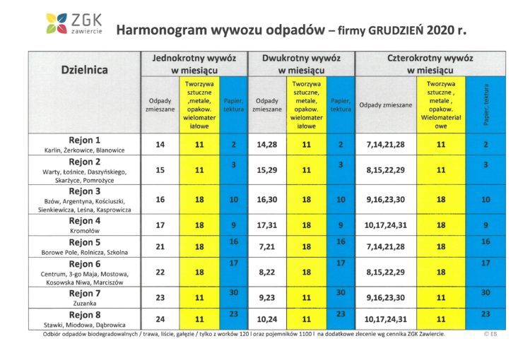 Harmonogram wywozu odpadów grudzień 2020 FIRMY