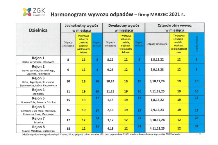 • Harmonogram wywozu odpadów dla Gminy Zawiercie w pierwszym kwartale 2026 roku 31 grudnia, 2025