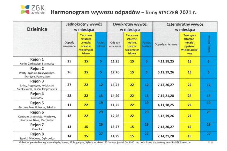 • Harmonogram wywozu odpadów dla Gminy Zawiercie w pierwszym kwartale 2026 roku 31 grudnia, 2025