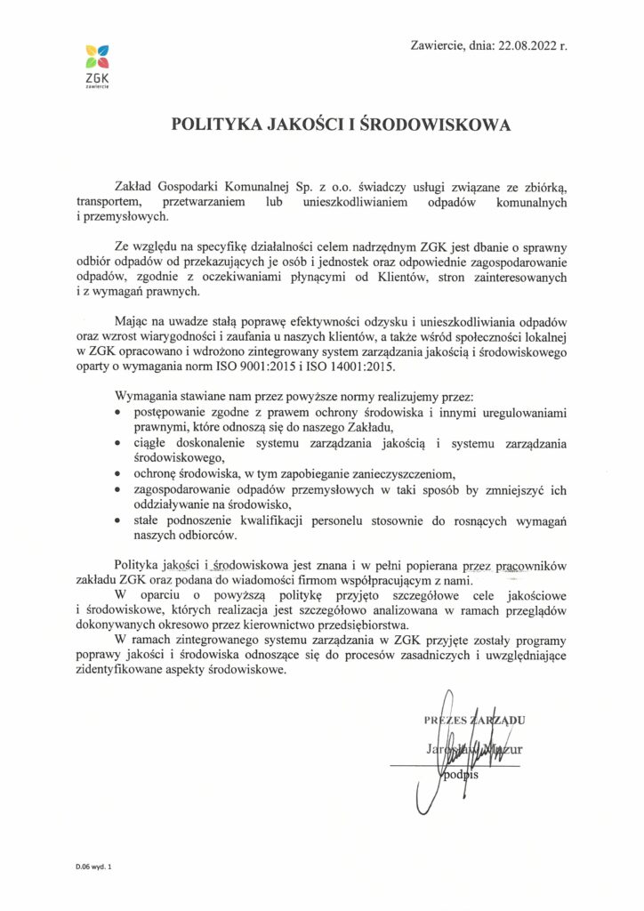 POLITYKA JAKOŚCI I ŚRODOWISKOWA