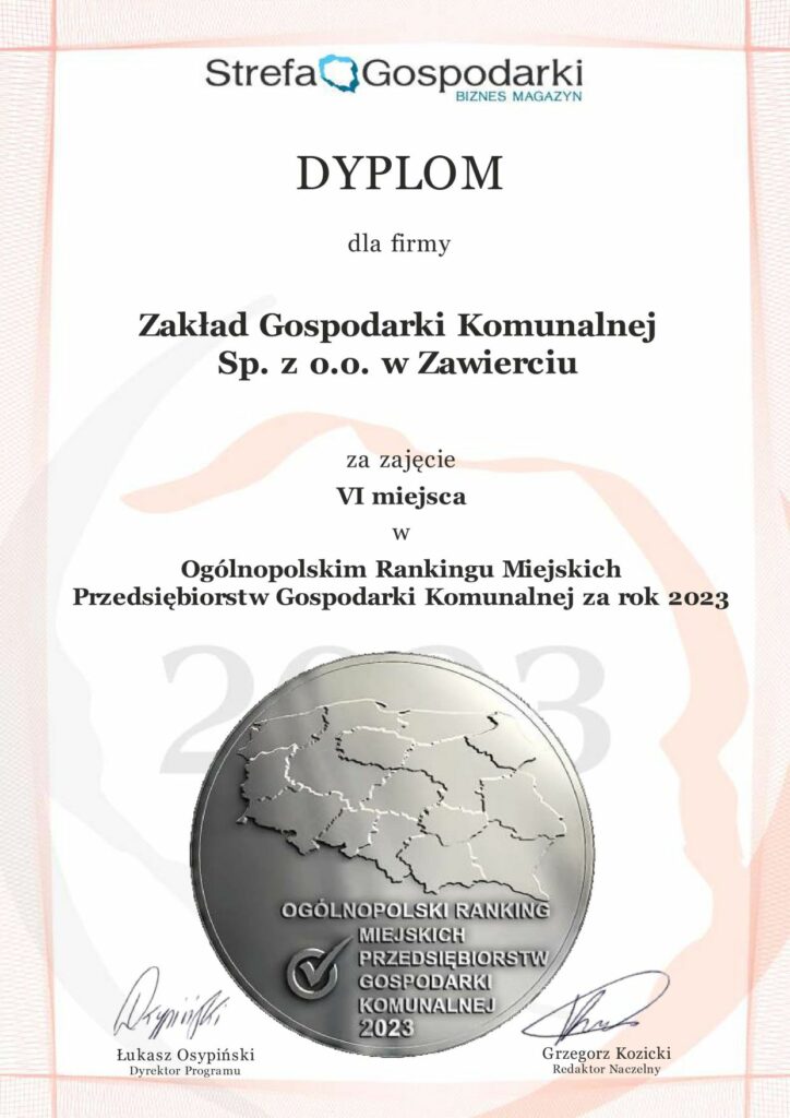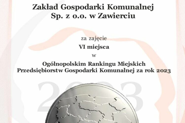 W corocznym Ogólnopolskim Rankingu Miejskich Przedsiębiorstw Gospodarki Komunalnej ZGK Zawiercie sklasyfikowane zostało na wysokim, szóstym miejscu poprawiając tym samym pozycję z roku 2022. Grupa ekspertów Dziennika Gazety Prawnej analizuje nie tylko sytuację finansową wszystkich przedsiębiorstw, poczynione przez nie inwestycje jak i bieżące funkcjonowanie. Jak podkreślają prezesi nagrodzonych spółek, już samo znalezienie się w rankingu jest nie lata wyróżnieniem.