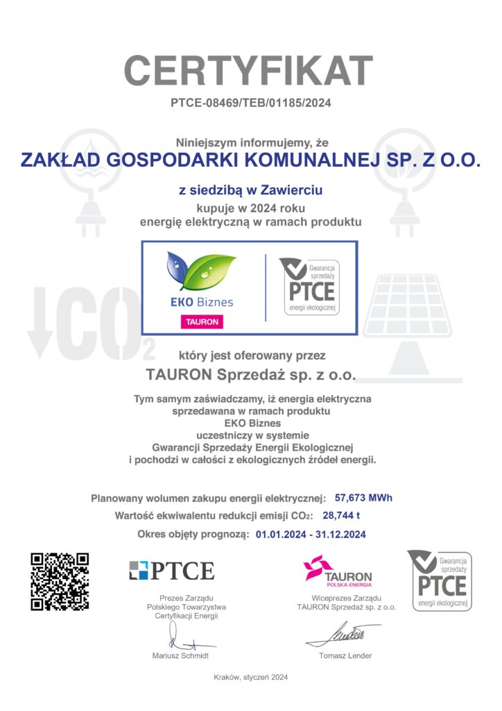 Miło nam poinformować, że otrzymaliśmy Certyfikat od Polskiego Towarzystwa Certyfikacji Energii (PTCE), który potwierdza faktyczną wielkość emisji CO2, jakiej udało się uniknąć naszemu Zakładowi.
