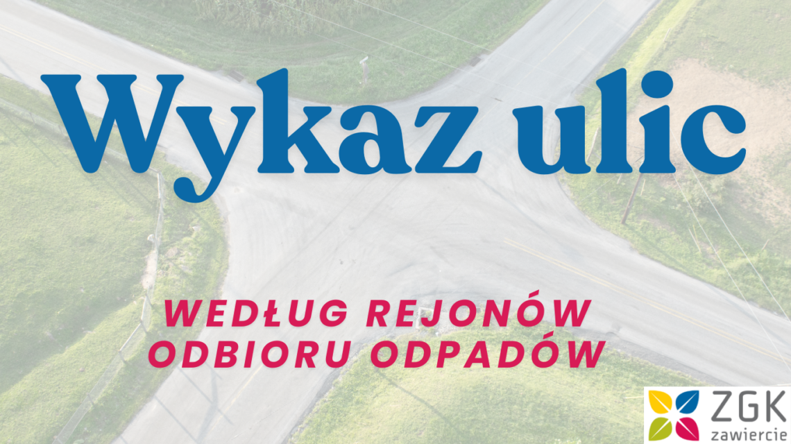 11 Listopada, Apteczna, Armii Krajowej, Astrów, Bankowa, Bliska, Borowa, Borowe Pole, Brata Alberta, Bratków, Chabrowa, Ciasna, Dawna, Dobra, Filtrowa, Gościnna, Górnośląska, Gruntowa, Hoża, Hugona Kołłątaja, Hutniczna, Jakuba, Jana III Sobieskiego, Jodłowa, Józefa Poniatowskiego, Kosowska, Kręta, Księżycowa, Kwiatowa, Lenartowicza, Lepsza, Lotnicza, Lwowska, Łowiecka, Makowa, Mała, Marszałkowska, Mikołaja Kopernika, Młyńska, Modrzewiowa, Morelowa, Narcyzów, Nowe Zawiercie, Nowomiejska, Obrońców Poczty Gdańskiej, Oświatowa, Piesza, Plac Jarosława Dąbrowskiego, Podkądzielowa, Podmiejska, Poprzeczna, Porębska, Poznańska, Przeskok, Pszenna, Rekreacyjna, Robotnicza, Rolnicza, Romantyczna, Romualda Traugutta, Różana, Rumiankowa, Stanisława Staszica, Staroszkolna, Stary Rynek, Storczyków, Szkolna, Ślepa, Świerkowa, Torowa, Towarowa, Wesoły Świat, Widok, Władysława Żyły, Włodowska, Wspólna, Żabia (od ulicy Górnośląskiej do ulicy Brata Alberta), Żurawia