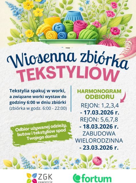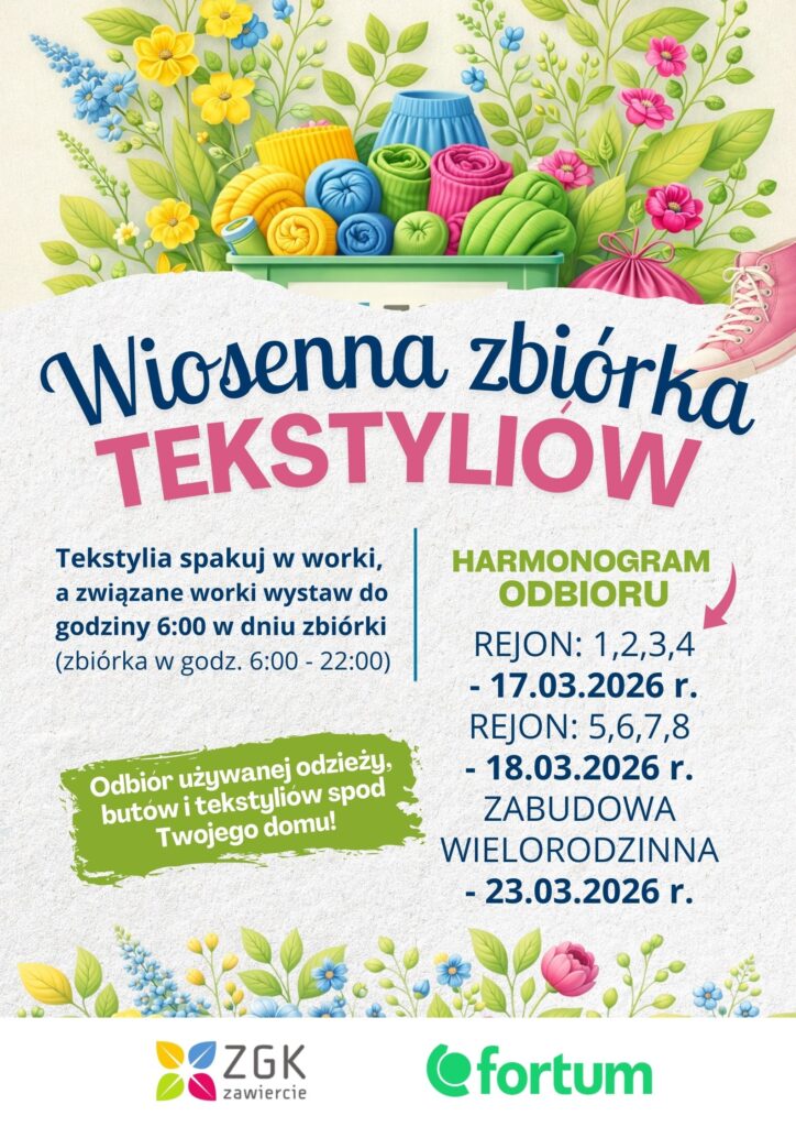 ZGK Zawiercie Sp. z o.o. oraz Fortum Silesia S.A zapraszają wszystkich mieszkańców do udziału w zbiórce tekstyliów! To doskonała okazja, aby w prosty sposób pozbyć się niepotrzebnych ubrań, butów, galanterii oraz innych tekstyliów w duchu recyklingu i dbałości o środowisko.