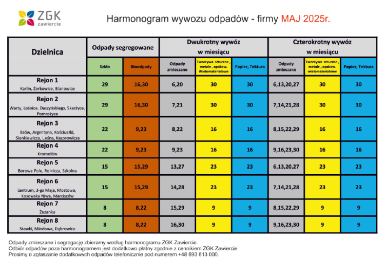 harmonogram wywozu odpadów firmy - maj 2025