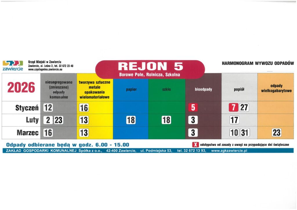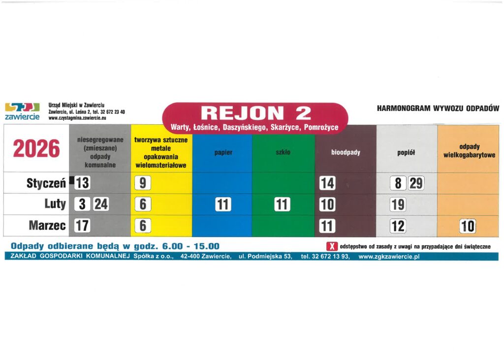 • Harmonogram wywozu odpadów dla Gminy Zawiercie w pierwszym kwartale 2026 roku